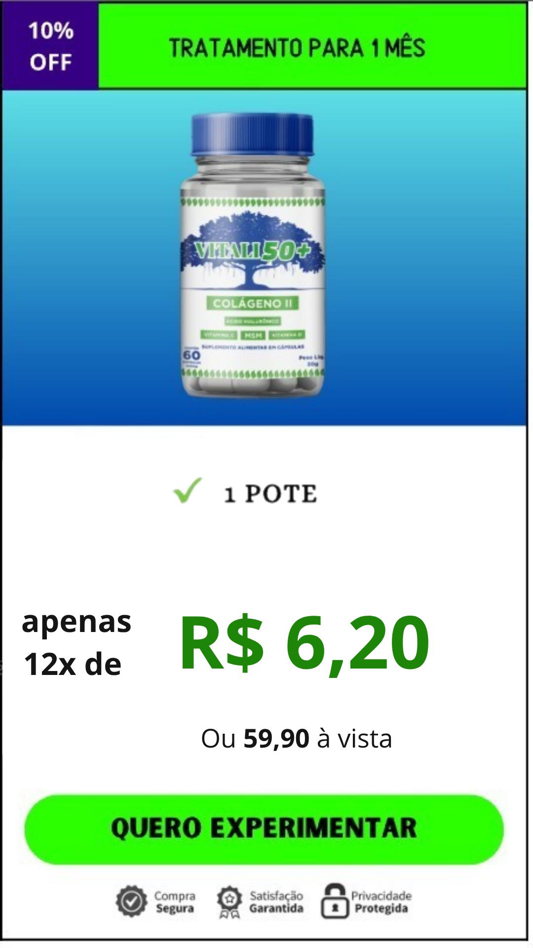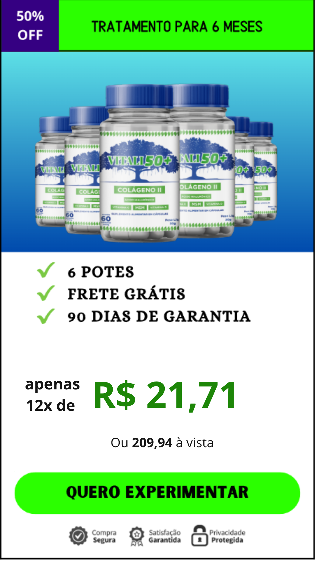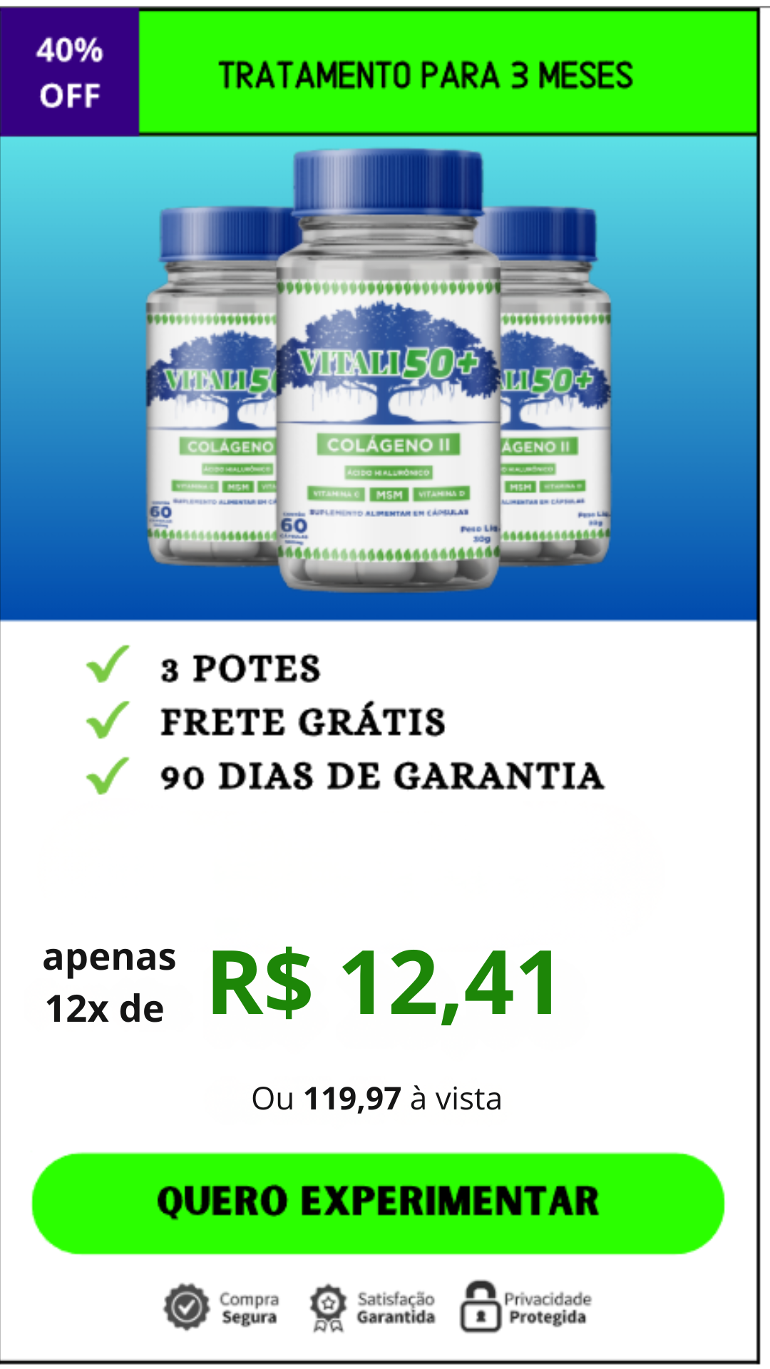 O segredo por trás do Vitali 50+ está em sua fórmula inovadora, que combina ingredientes naturais premium e tecnologia de ponta. Com nossa poderosa fórmula 50+, o Vitali 50+ revitaliza as articulações, estimula a regeneração do tecido cartilaginoso, reforça a flexibilidade e proporciona uma nutrição profunda para uma melhor saúde articular.